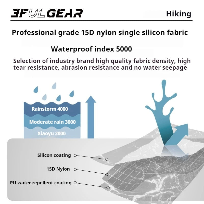- Weather-ready shell offers 2000–3000 mm waterproofing with a 15D nylon silicone-coated outer fabric and a breathable 20D inner mesh layer for airflow and comfort.