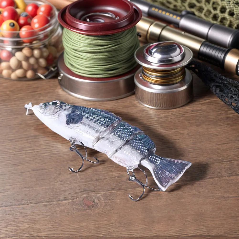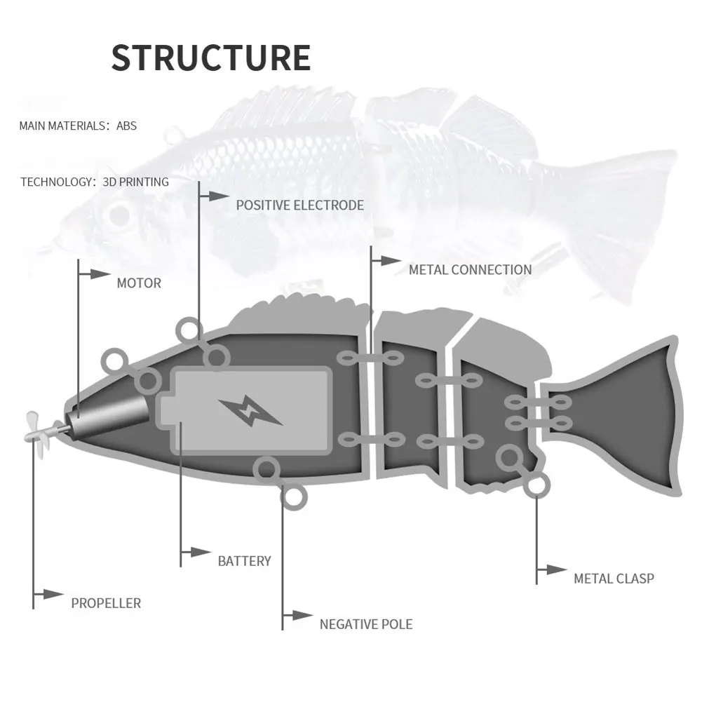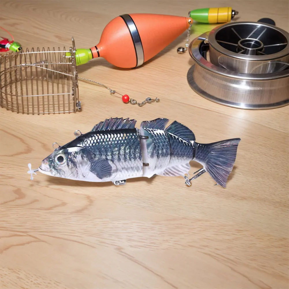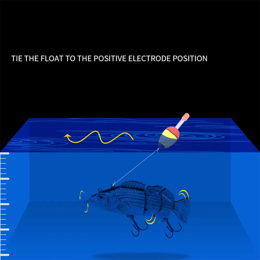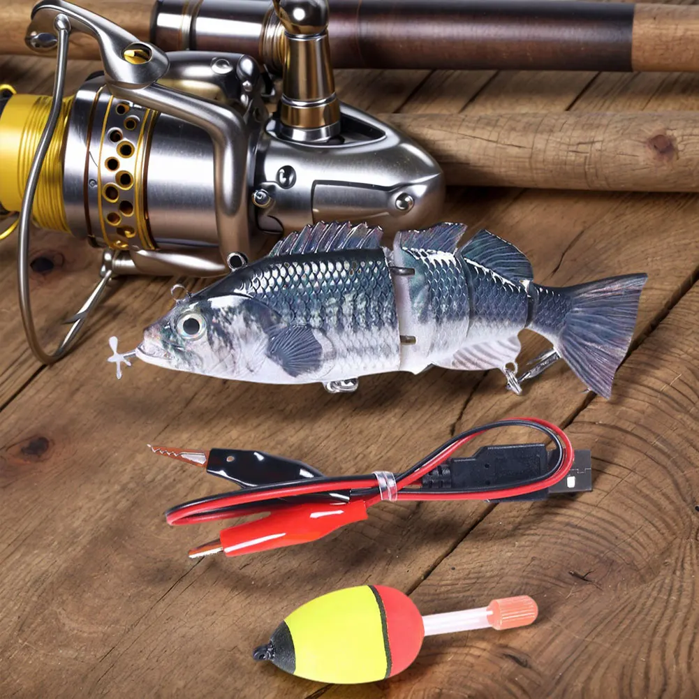 Robotic Swimming Lures USB Rechargeable Auto Electric Lure Bait Fishing Wobblers Fishing Lure Fishing Bait for Pike Bass Trout Features: 1.Versatile Design: The flexible and versatile body of this fishing lure mimics a realistic swimming motion in the water. With its dynamic design, it is sure to attract more fish and increase your chances of catching your target with the robotic swimming lure. 2.Sturdy Connectors: Constructed with metal connectors at various points, this fishing lure can withstand strong bites, unlike regular lures that may easily break under pressure from big fish bites. 3.Snag-Resistant Swim: Designed to work seamlessly with bobbers and leaders, this fishing wobbler prevents entanglement with underwater debris, ensuring smoother movement through the water. 4.Depth Adaptability: By using leaders of varying lengths, this swimbait allows you to control its depth range for different water conditions, keeping the fishing action well within your command. 5.Convenient USB Charging: Equipped with a USB charging interface, this fishing crankbait offers convenient recharging and addresses long charging times effectively. Specification: Origin: Mainland China Size: 140mm/5.51inch Material: ABS Weight: 53g Note: 1 x Fishing Lure 1 x Charging Cable 1 x Float