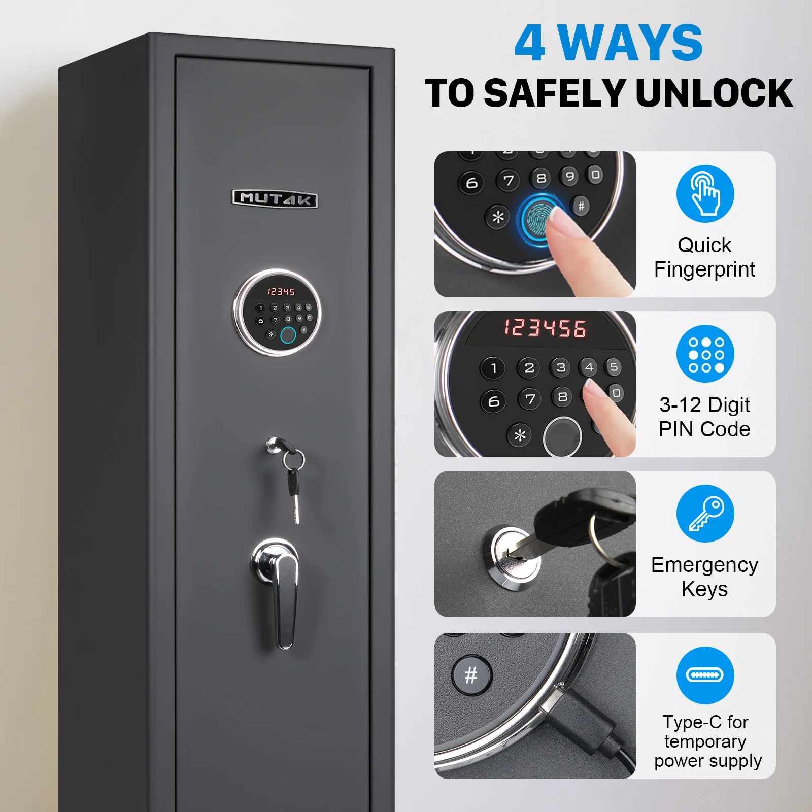 【Quick Aceess Gunsafe】 This gun cabinet has four unlocking methods: 1.password. You set 3-8 digits password to program the gun safe for quick access to your firearms.2.emergency key. 3. Design with Type-C Port for temporary Power. The product requires 4*5AA batteries.( Note that the package does not include batteries.)