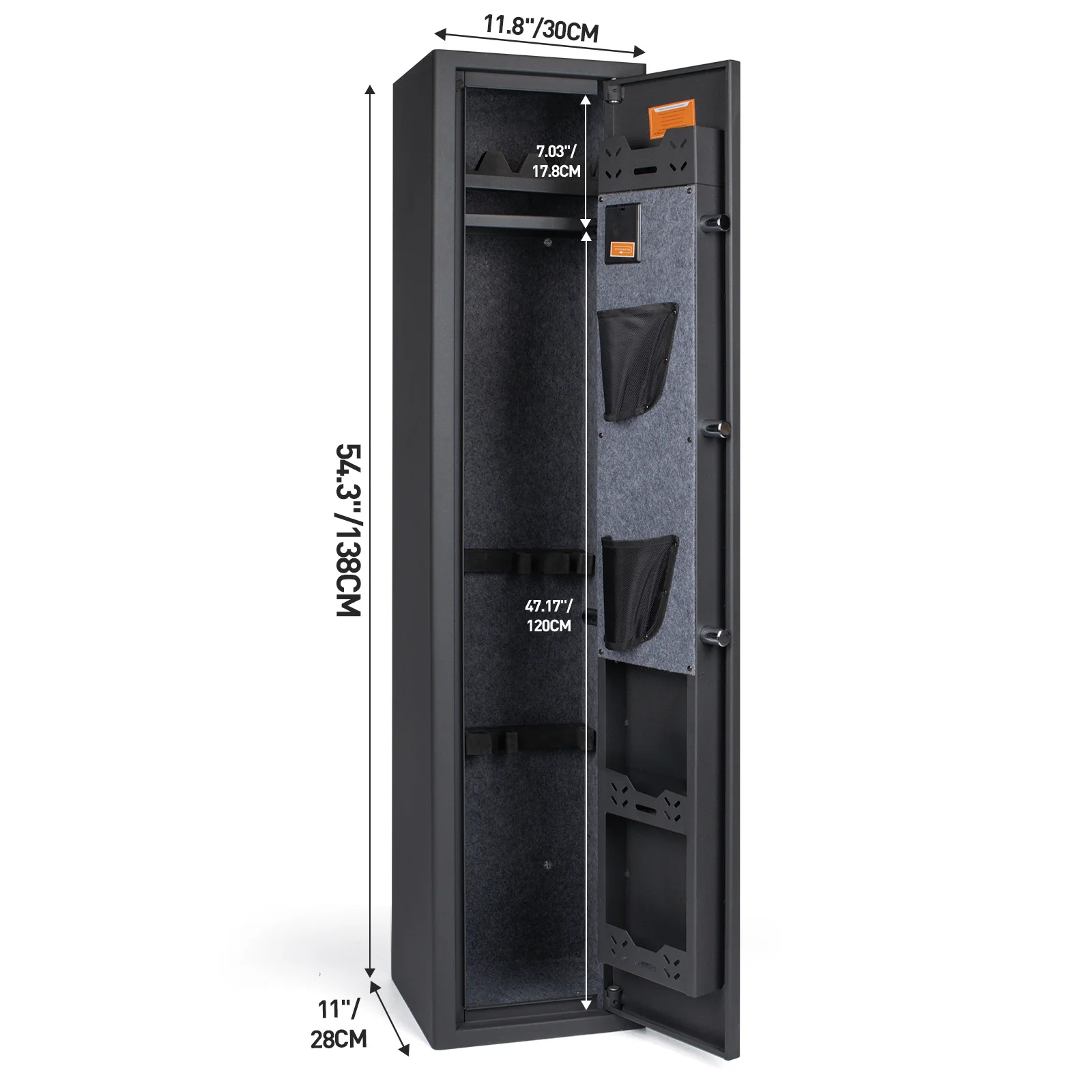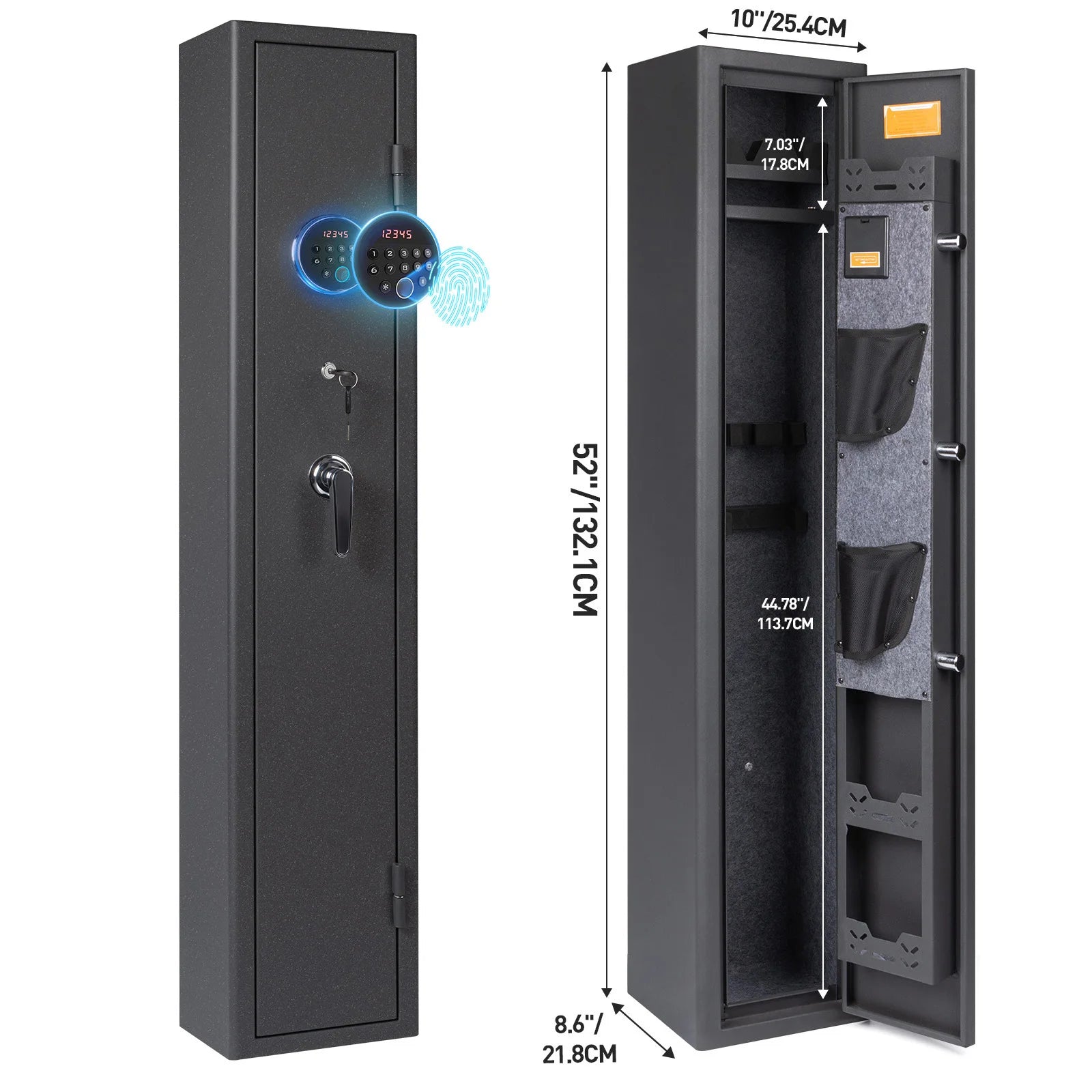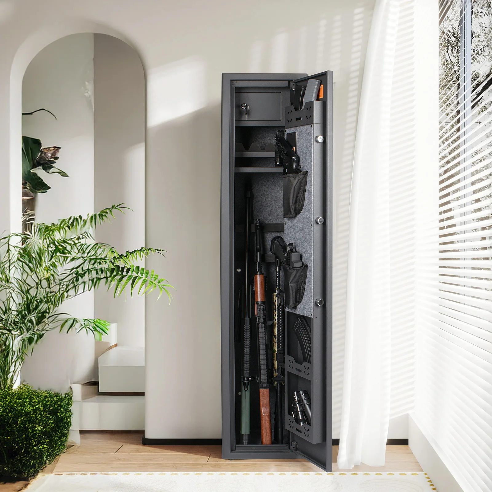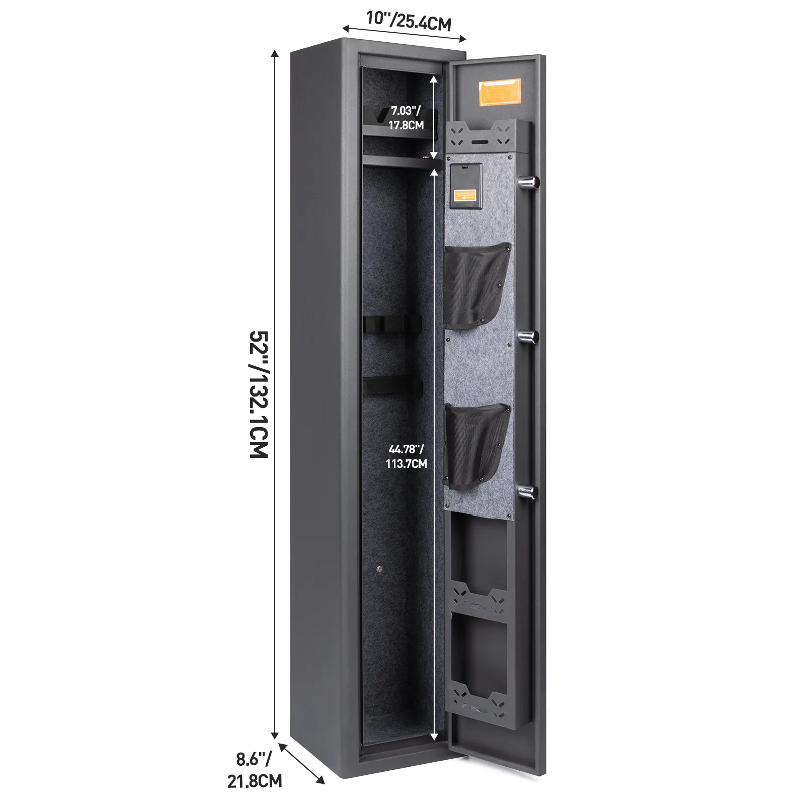 【Rifle Gun Safe Cabinet 】Larger and deeper long rifle cabinet,There's a detachable shelf inside the safe for three Rifle and some spare parts. The rifle safe door is equipped with two pistol bags and two ammunition boxes, for storing ammunition, gun accessories, etc.,The gun cabinet opens at a 210° angle, and the LED light automatically illuminates for quick access to the firearms.