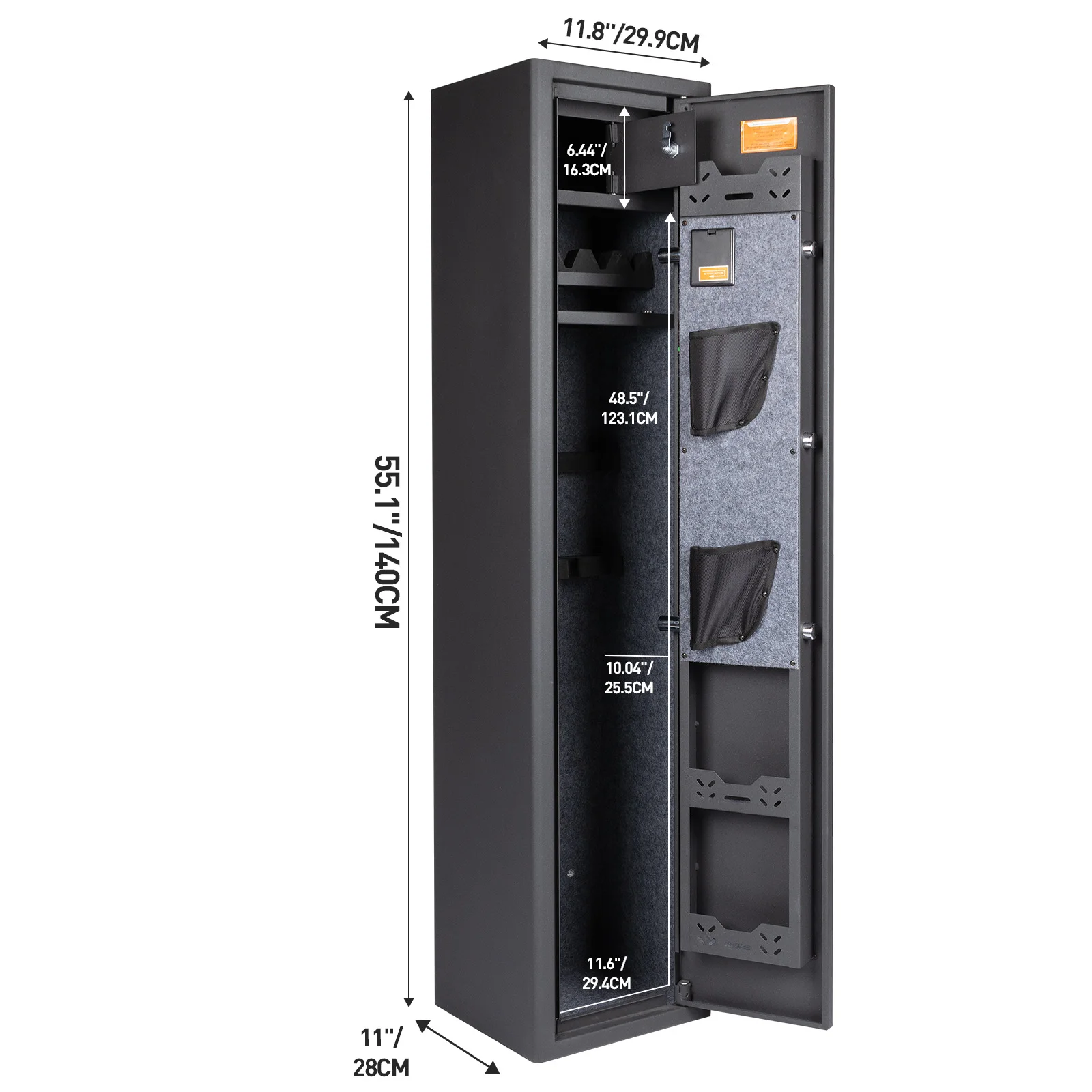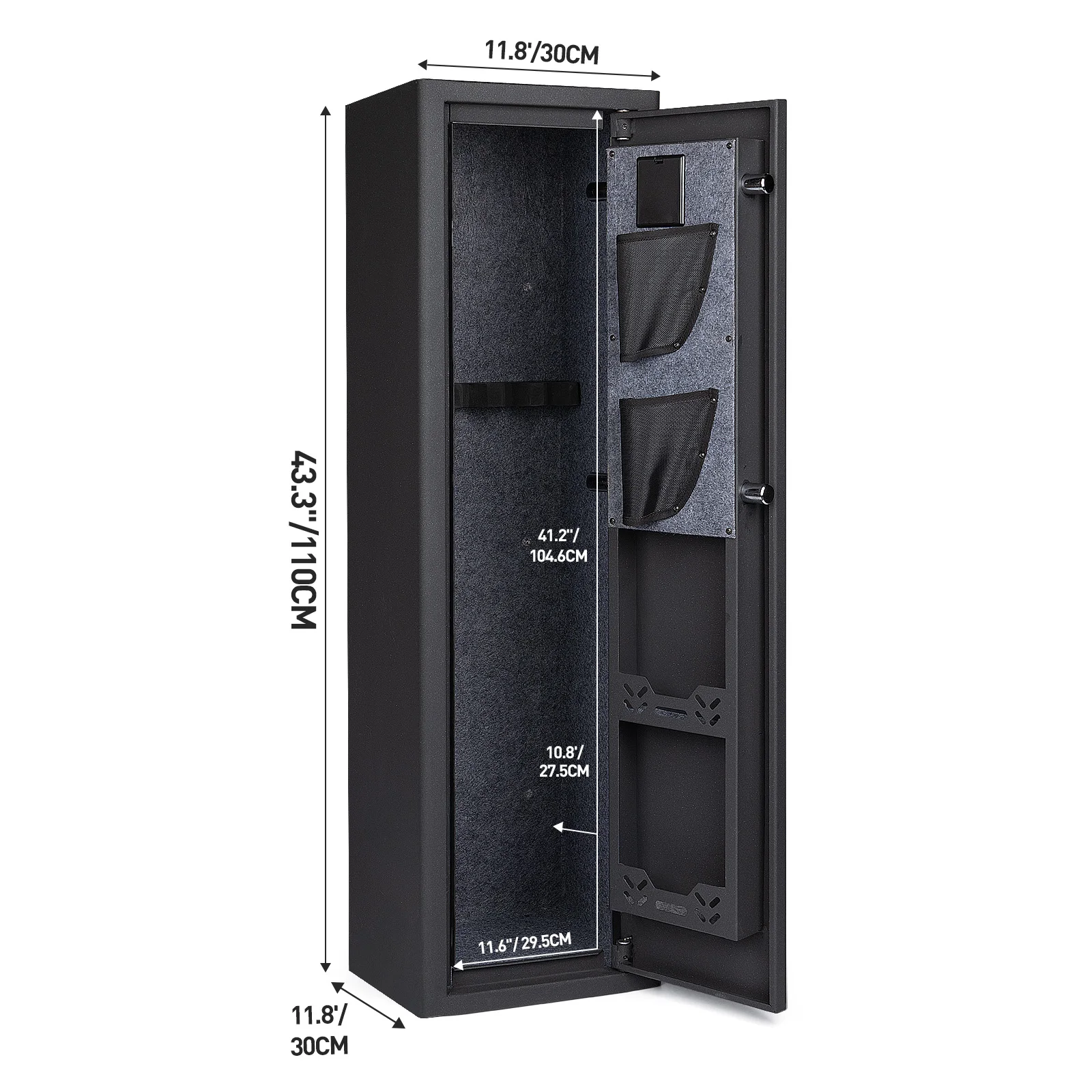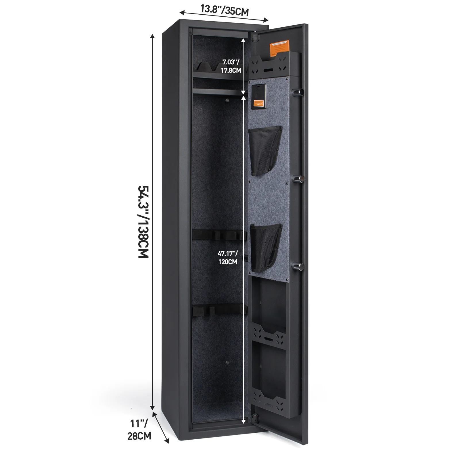 【Rifle Gun Safe Cabinet 】Larger and deeper long rifle cabinet,There's a detachable shelf inside the safe for three Rifle and some spare parts. The rifle safe door is equipped with two pistol bags and two ammunition boxes, for storing ammunition, gun accessories, etc.,The gun cabinet opens at a 210° angle, and the LED light automatically illuminates for quick access to the firearms.