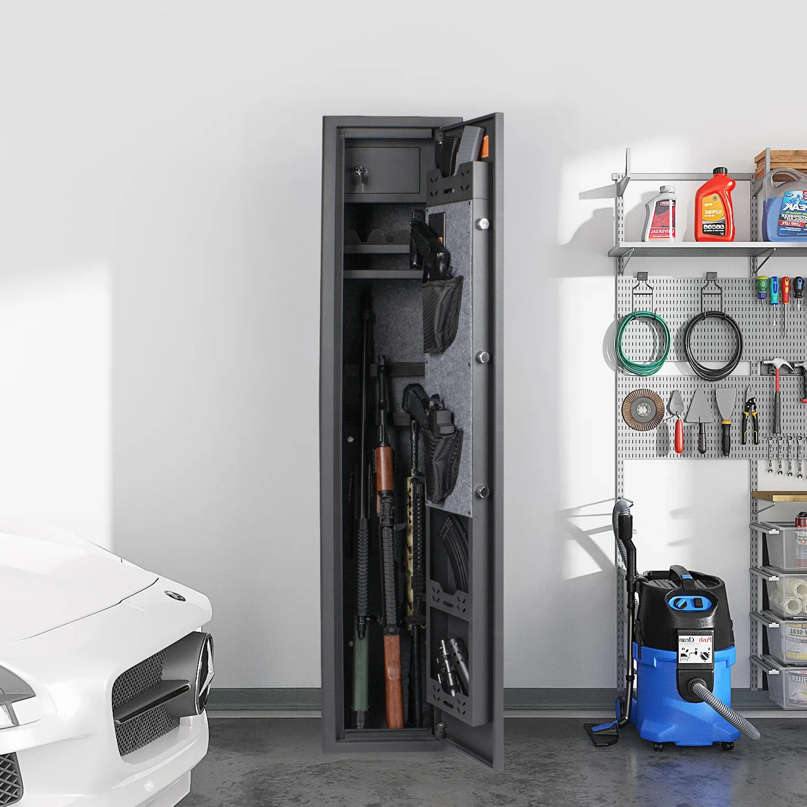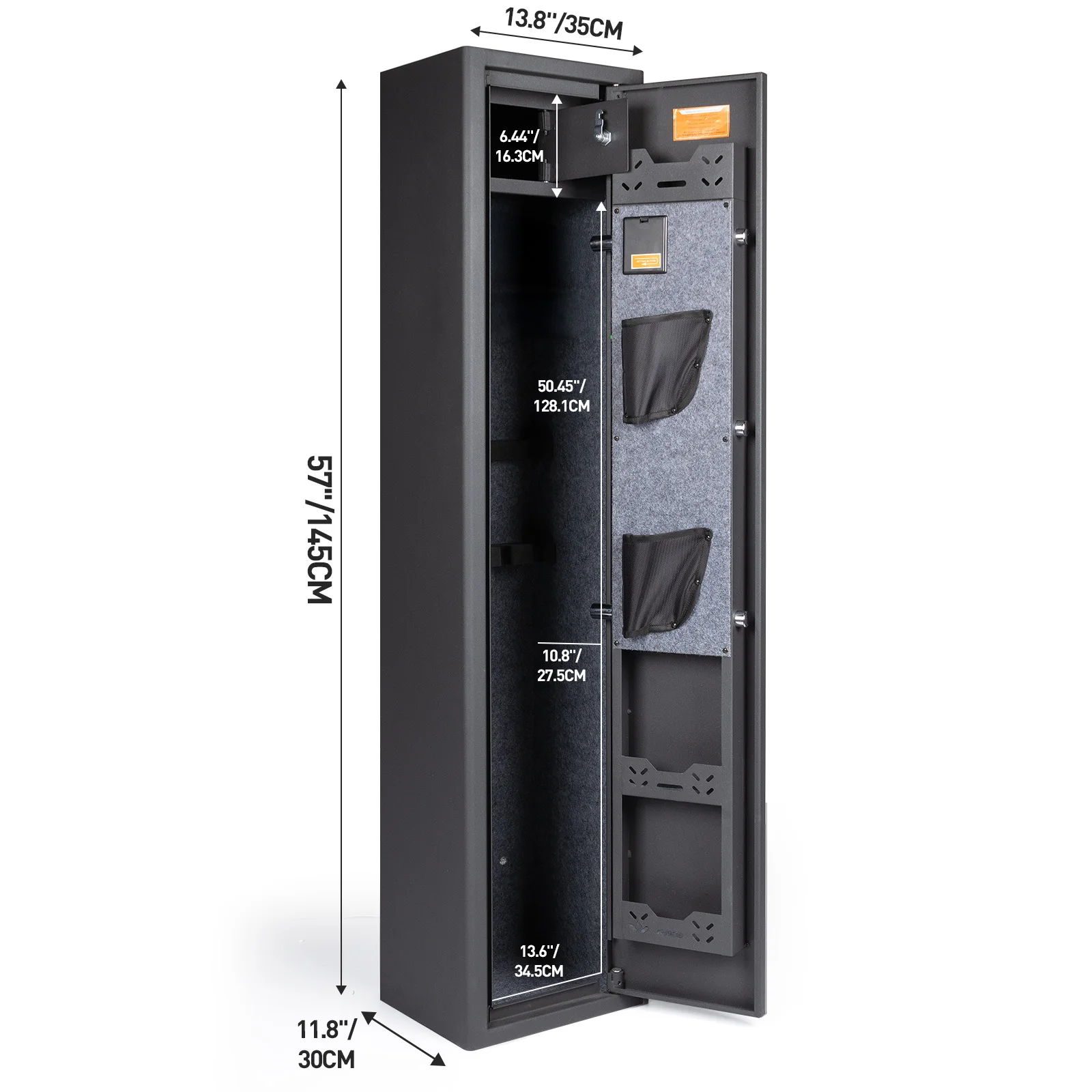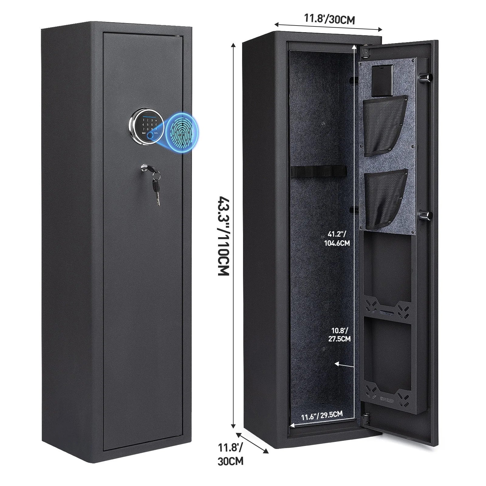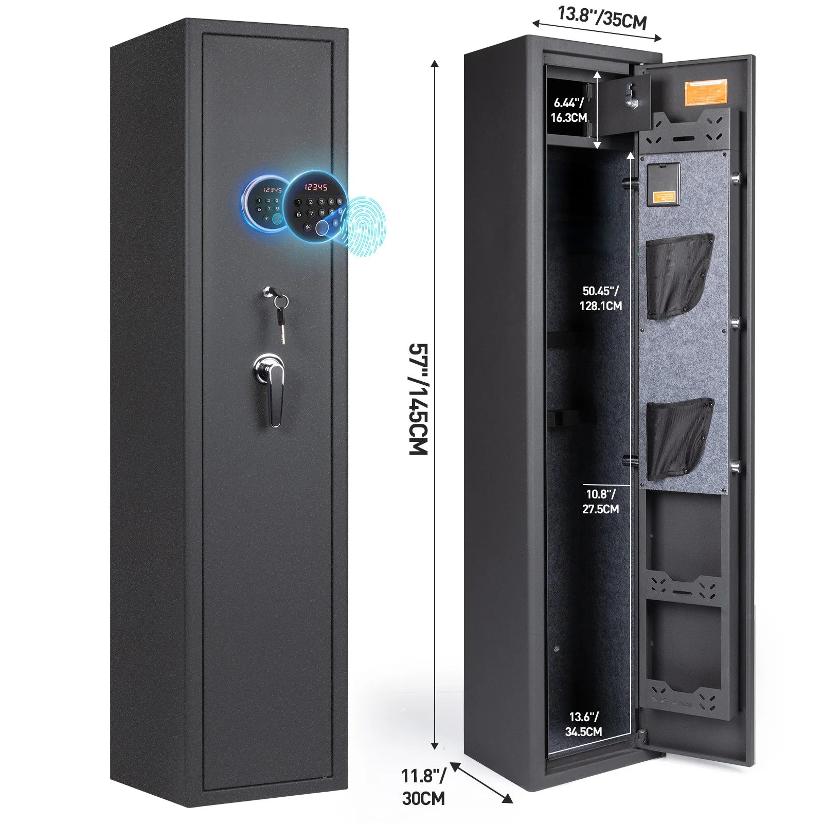 【Rifle Gun Safe Cabinet 】Larger and deeper long rifle cabinet,There's a detachable shelf inside the safe for three Rifle and some spare parts. The rifle safe door is equipped with two pistol bags and two ammunition boxes, for storing ammunition, gun accessories, etc.,The gun cabinet opens at a 210° angle, and the LED light automatically illuminates for quick access to the firearms.