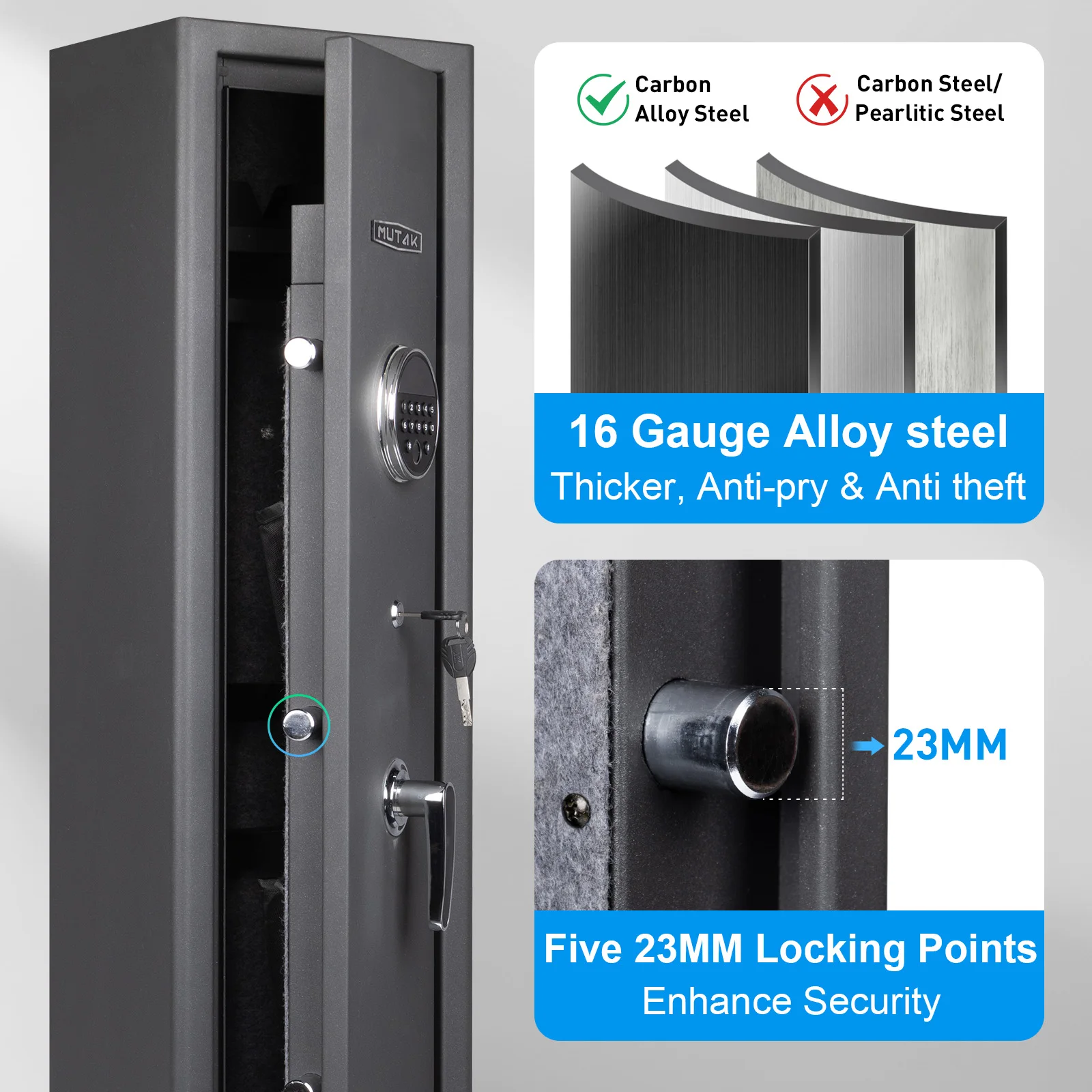 【Sturdy and Durable】The gun safe is made of 16 Gauge Alloy steel, equip with high strength and impact resistance, thicker, anti-pry & anti theft, protected guns are safer.