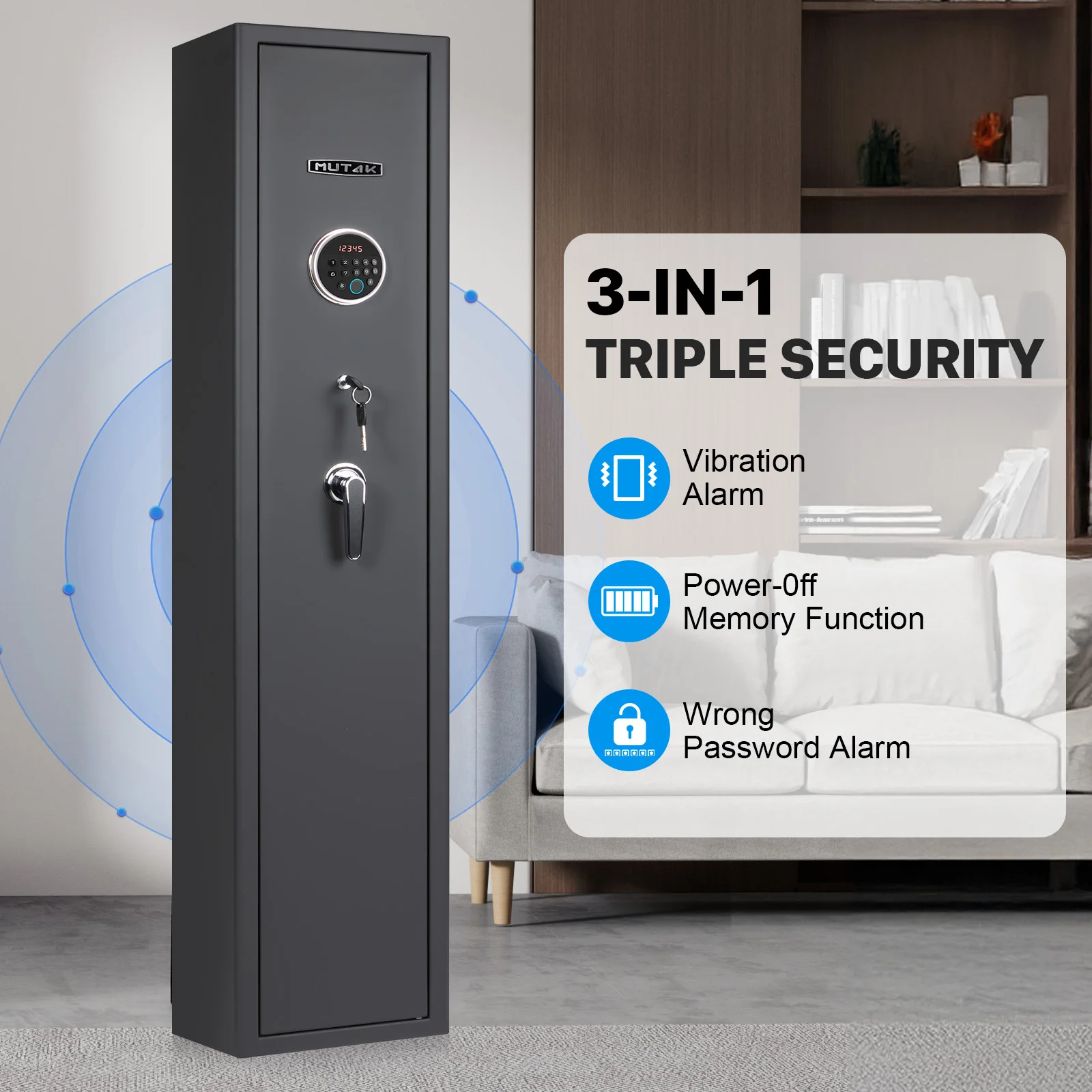 【Ultra High Security Protection】Dual alarm system + Mute Mode,equipped with a dual alarm system, our rifle gun safe offers enhanced security measures.After 3 times wrong password or strong impact occurs,the alarm system will awake and beep for 30 seconds. This prevent kids from opening your gun locker. TIPS: The dual alarm mode is still effective in silent model;