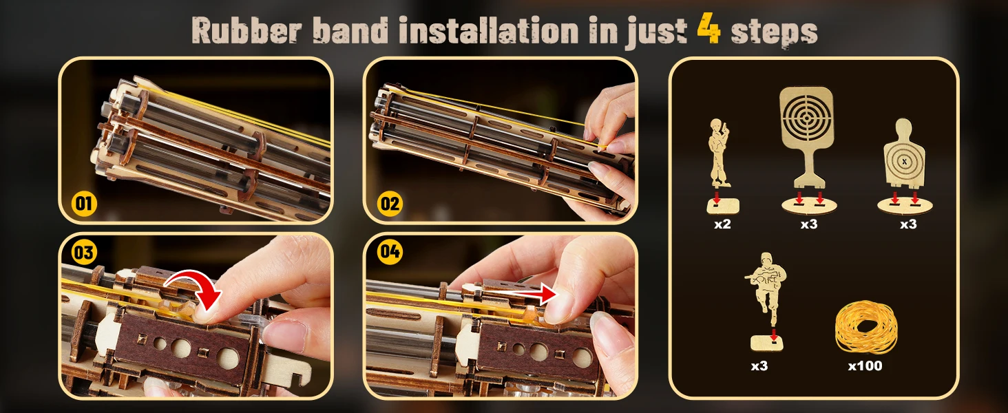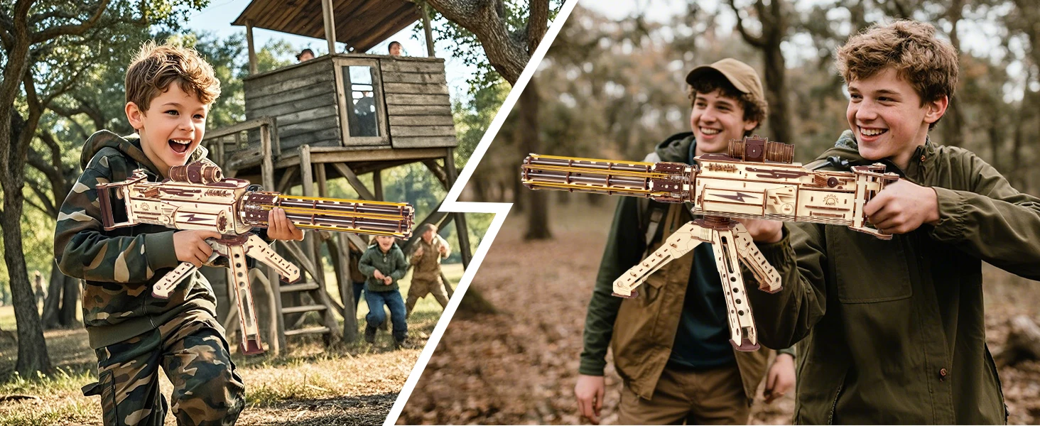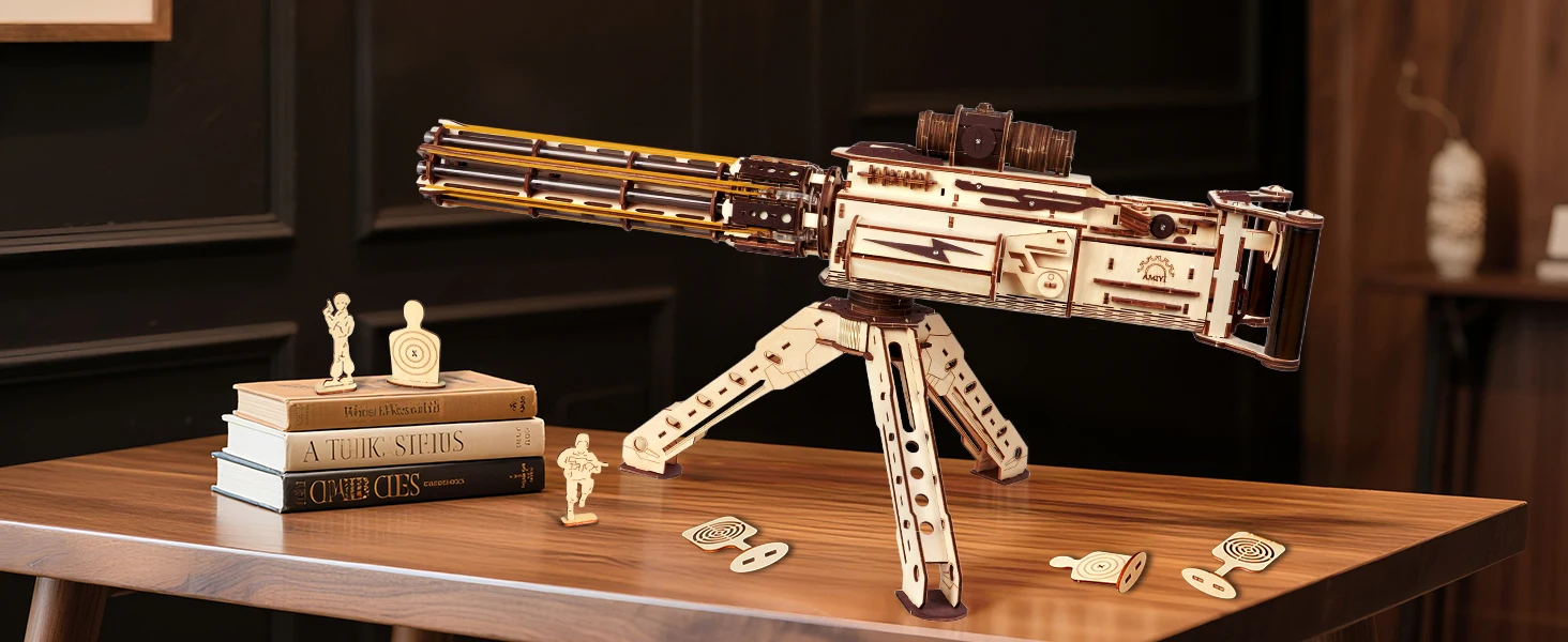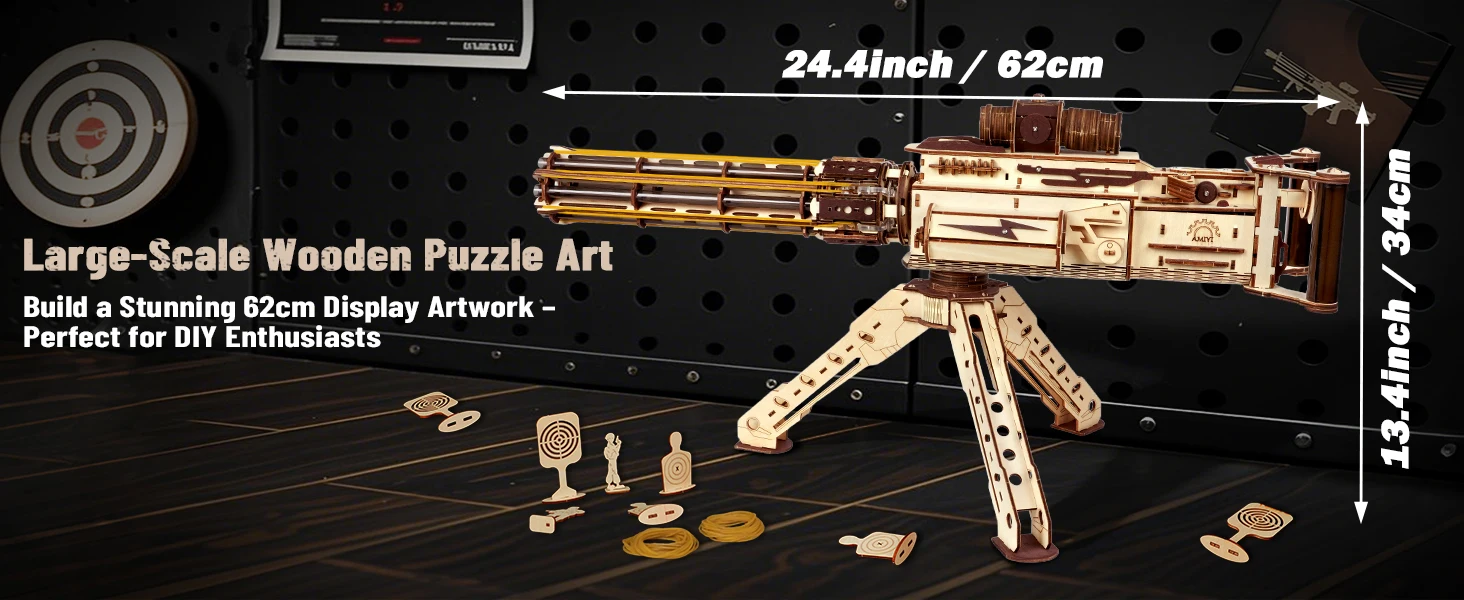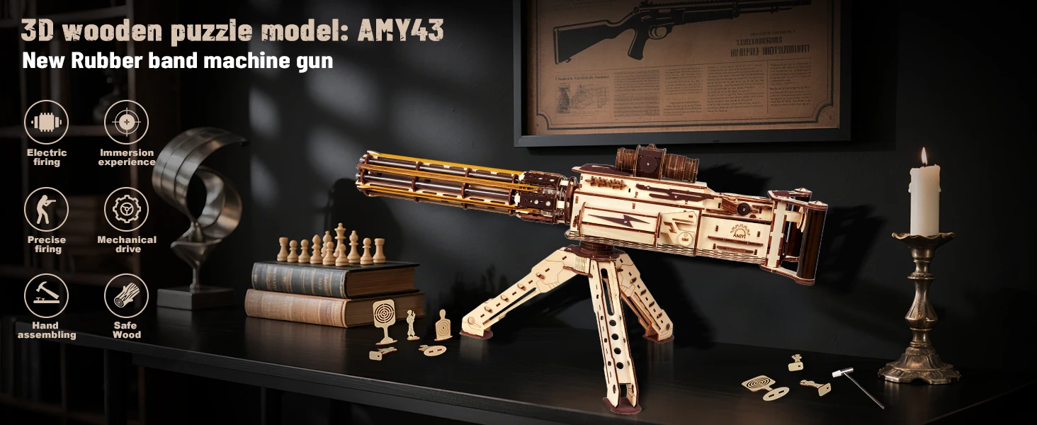 【6 Rotating-Barrel, Continuous Shooting】The new 3D wooden puzzle model - AMY43 machine gun, which uses rubber bands as bullets and adopts a 6-tube rotating magazine design. Each tube can be pre-loaded with 5 rubber bands, powered by an electric gear mechanism for rapid-fire—30 rounds with a range of 8–10 meters! And we provide 100 rubber band bullets and 11 wooden targets for immersive aiming and shooting fun