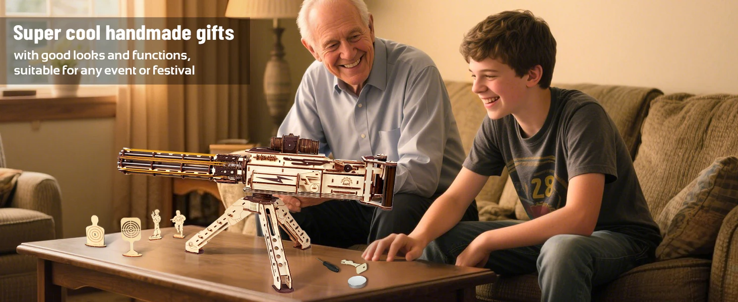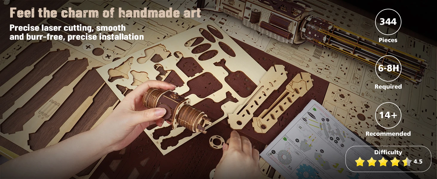 【Unique Design, Assembly Challenge】This 3D wooden puzzle perfectly reproduces the mechanical aesthetics of the machine gun with a unique design. The 344 high-precision cut parts are carefully designed to create a challenging assembly experience. The overall shape is made of wooden brown tones, and each part has a clear digital number, which can provide precise positioning guidance during assembly, making the assembly process both challenging and fun