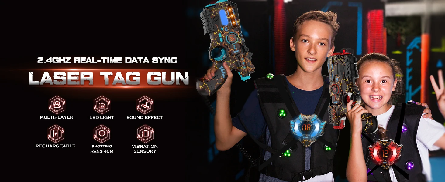 【Upgrade 2,4GHz Laser Tag Set】 Bring the ultimate laser tag game experience to your backyard, park, or outdoor space! This rechargeable laser tag set includes 2 guns and 2 vests, perfect for kids, teens, and adults aged 6-12+, 2.4GHz data synchronisation which keeps a score for all players and an LED display on both the guns and vests, this set delivers non-stop action and excitement. Whether it's a family game night, or a birthday party, this cool and tech-savvy set is sure to be a hit!