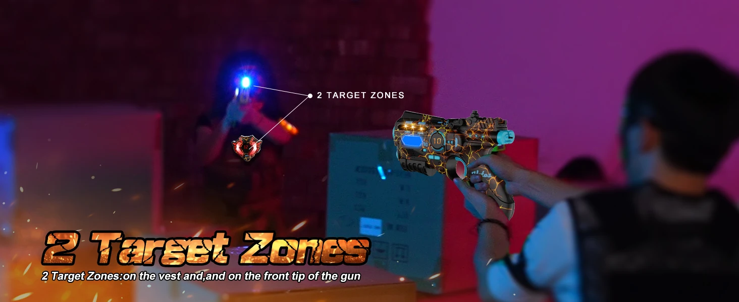 【Advanced Features for Intense Battles】 Take your laser tag game to the next level with Stealth Mode, and 4 weapon models(SINGLE SHOT, SHOTGUN, MACHINE GUN and SUBMACHINE GUN) to choose from. which vary in effectiveness and damage. Plus you can reload the gun by simply pushing the clip back which keeps the game fast-paced. The 2.4GHz data sync ensures seamless communication between guns and vests, while the multi-zone targets (chest and gun) make every battle thrilling